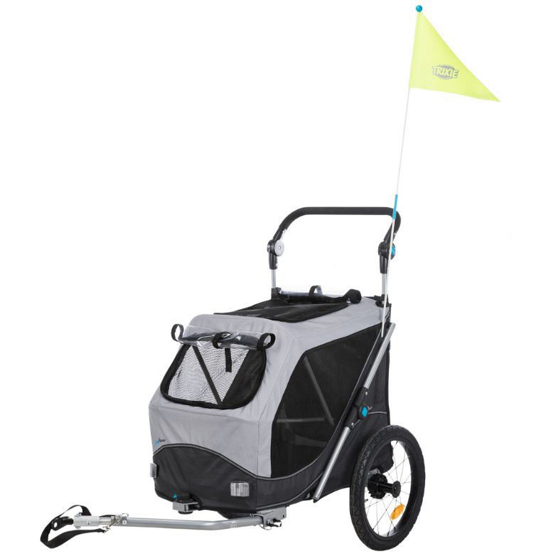 Makkelijk inklapbare hondenfietskar met een veiligheidsvlag en reflectoren. De fietskar is eenvoudig om te bouwen tot jogger. Draagvermogen tot 15, 22 of 30 kg.