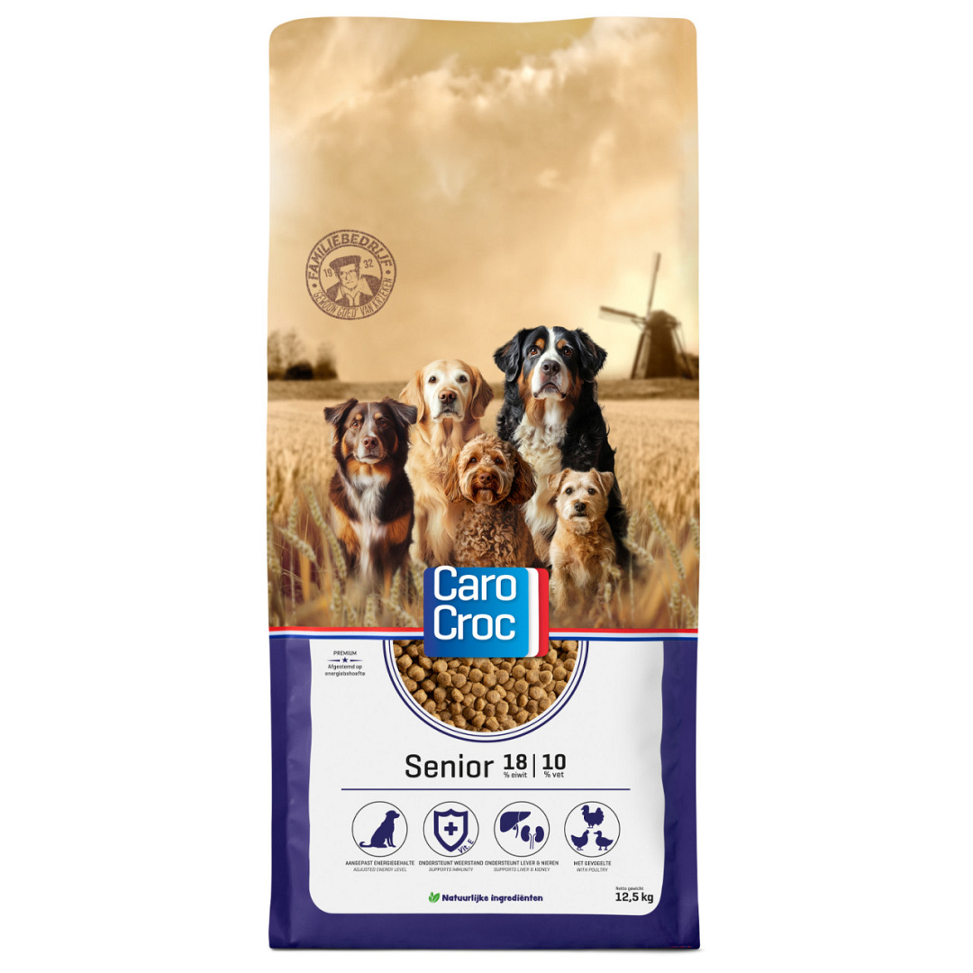 CaroCroc Senior 18/10 is een volledige voeding voor senior honden. Naarmate je hond ouder wordt, verandert de voedingsbehoefte. Oudere honden (vanaf ongeveer 7 jaar) hebben een lagere eiwit- en mineralenbehoefte. Voor het welzijn van je hond is het belangrijk de voeding hierop aan te passen. De samenstelling van CaroCroc Senior 18/10 is afgestemd op de behoefte van oudere honden. Hierdoor wordt de nier- en leverfunctie ondersteund.