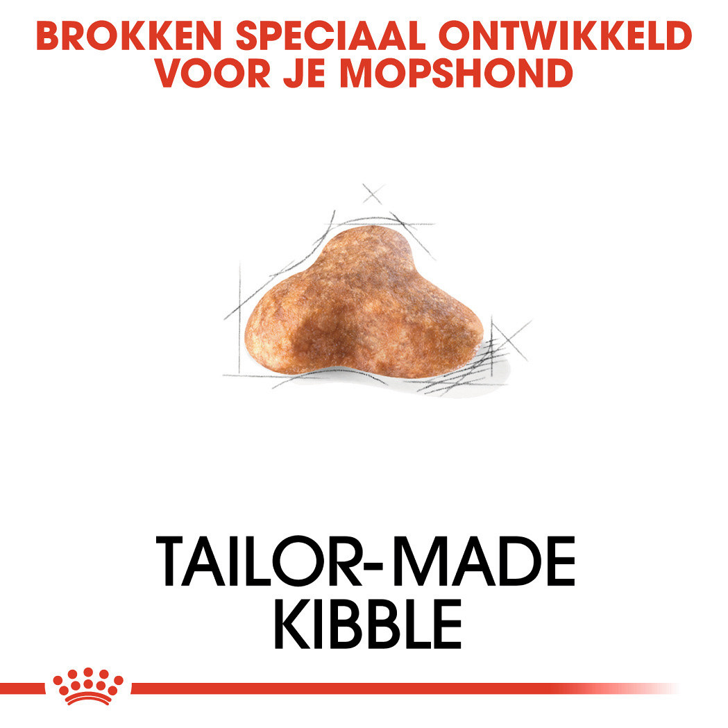 Geen volgzamere hond dan je Mopshond. Hij is gevoelig, vrolijk en trouw. Aandacht vindt hij heerlijk, en je Mopshond is dan ook graag in je gezelschap. Deze hond heeft wel een aantal aandachtspunten, zoals zijn gewicht en zijn ademhaling. Vooral tijdens warme dagen kunnen de dikke tong, het zachte gehemelte en de kleine neusgaten voor problemen zorgen. Zeker als hij (iets) te dik is. Speciaal voor de gedrongen Mopshond is er Royal Canin Pug Adult.