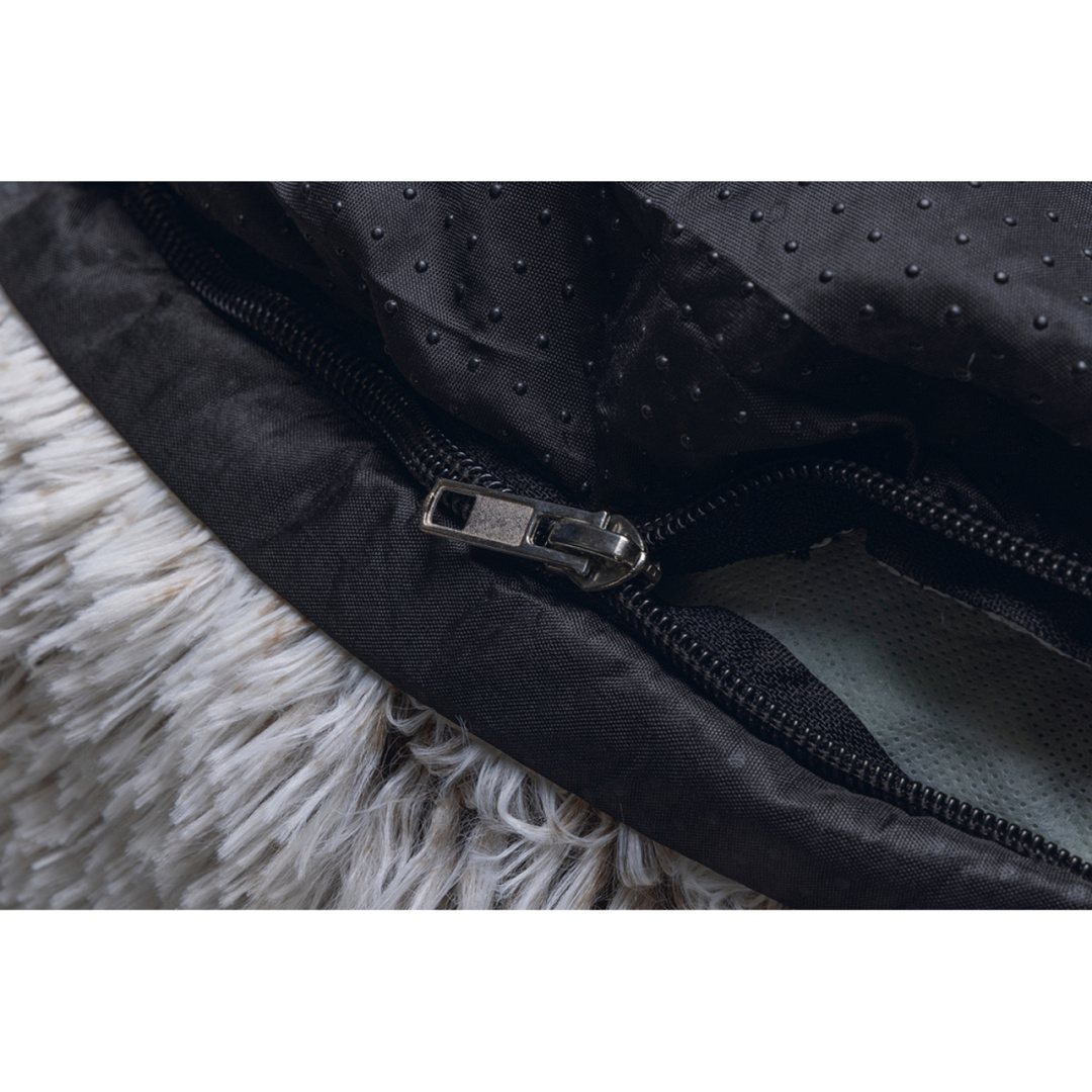 De mand is bekleed met zachte, lange pluche. Door de brede, zachte randen kan jouw hond zijn hoofd laten rusten tijdens het slapen. De onderzijde is voorzien van een antisliplaag, zodat de mand stevig op zijn plek blijft. De hoes is afneembaar dankzij de ritssluiting, waardoor deze gemakkelijk schoon te houden is. De mand beschikt over een waterafstotende binnenhoes om het kussen te beschermen tegen vocht en vuil.
