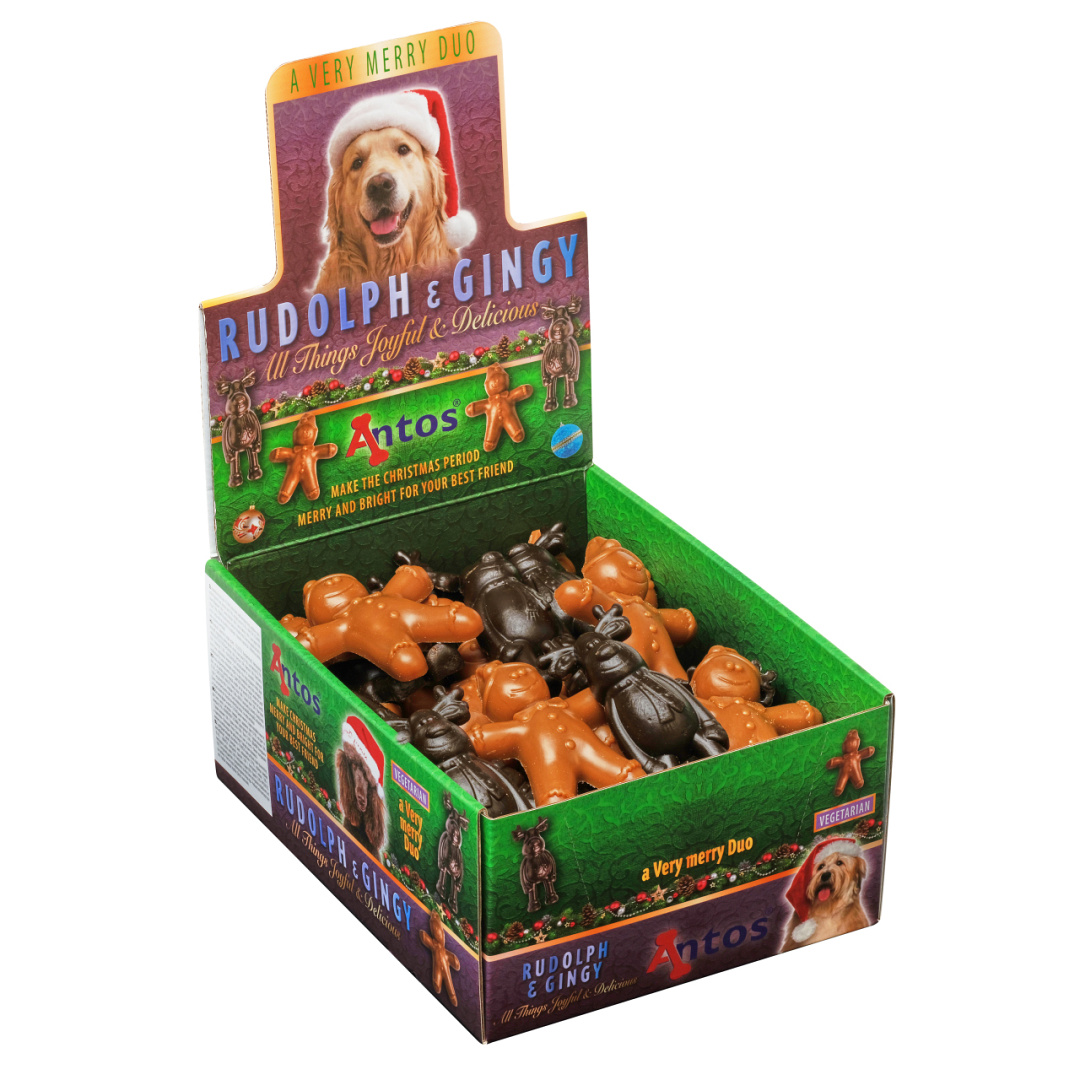 Laat je hond deelnemen aan de kerstsfeer met deze Rudolph & Gingy hondensnacks van Antos, een heel vrolijk duo. Deel je liefde voor kerst met je hond dankzij deze vrolijke snacks.