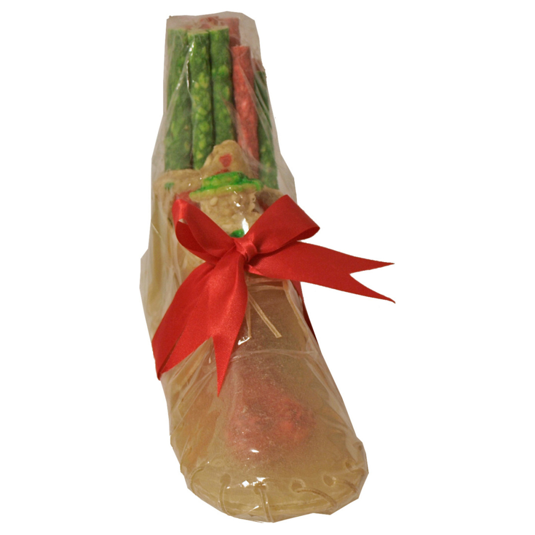 Feestelijke kauwschoen van buffelhuid, gevuld met munchy kauwstaafjes.