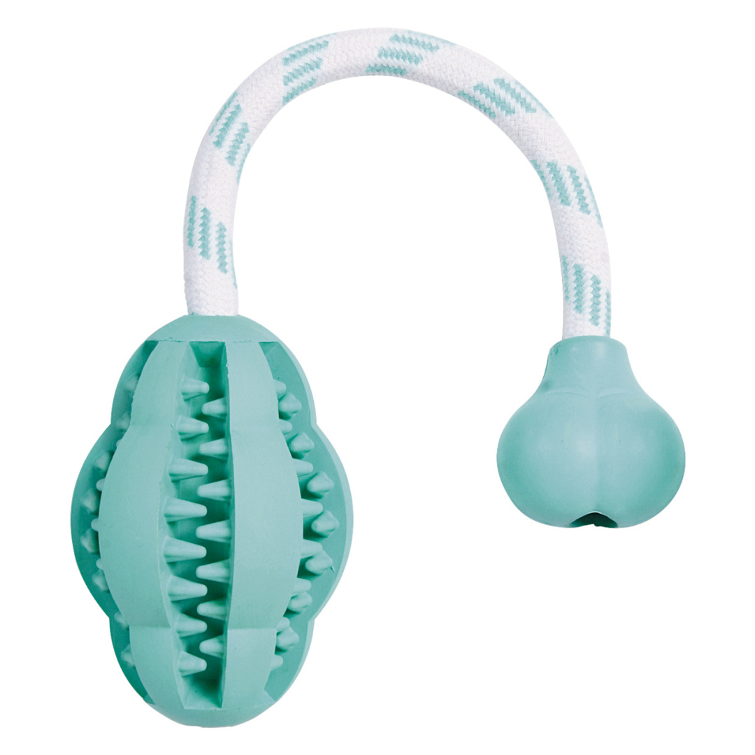 Trek- en sjorspeeltje met muntsmaak. De natuurrubberen elementen aan de uiteinden masseren het tandvlees tijdens het spelen.
