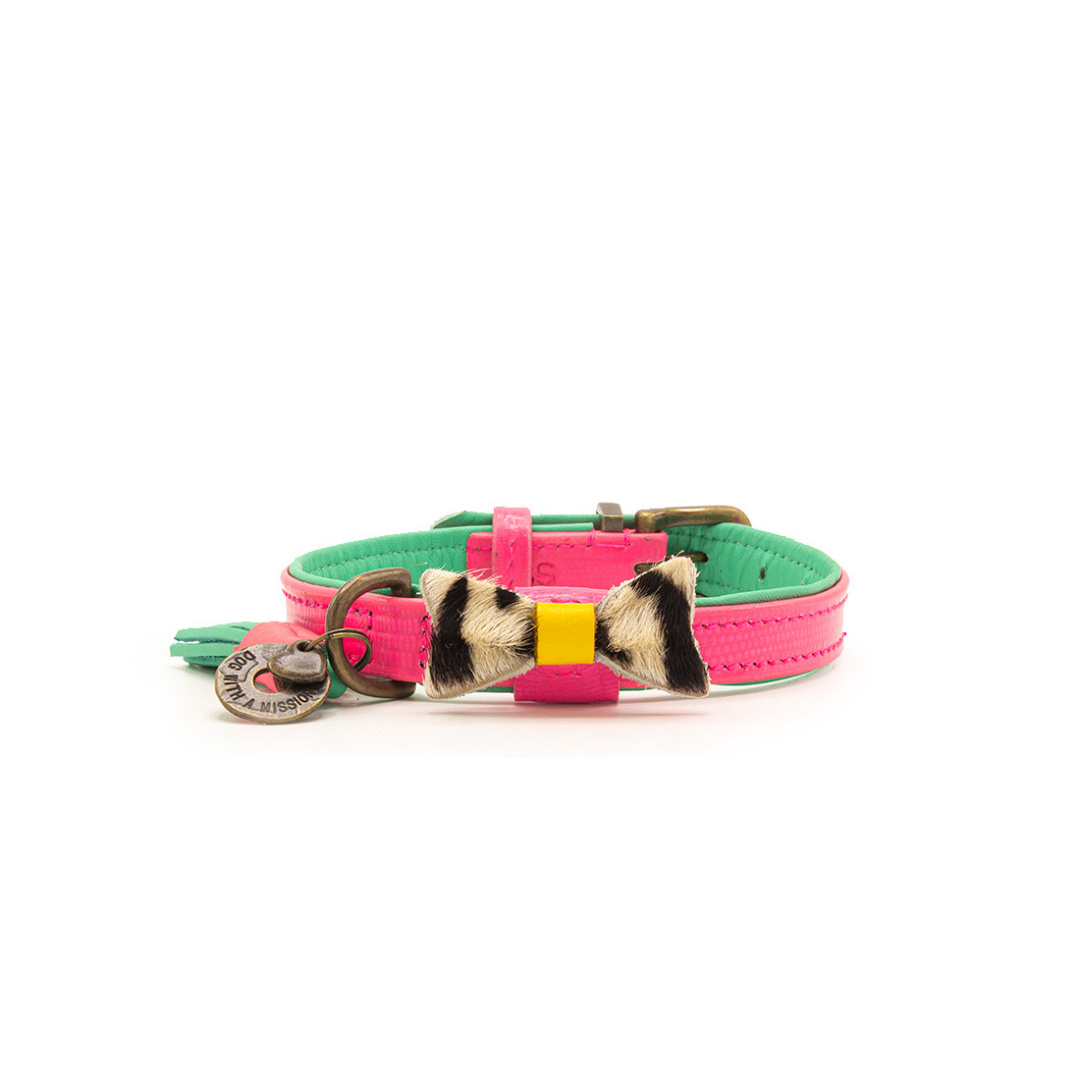 De Dog with a Mission Halsband Blossom is toch wel de meest kleurrijke combo voor de zomer. Een normale strik is ook maar zo gewoon toch? Deze prachtige roze halsband is afgemaakt met een zebrastrik, een zachte turquoise binnenkant en gele details.
