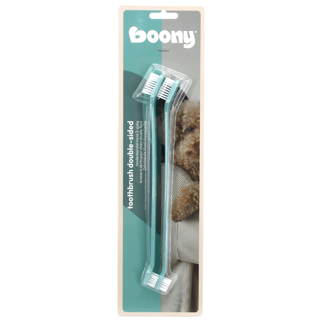 Met deze Boony set van 2 tweezijdige tandenborstels zorg je eenvoudig voor een frisse adem en een gezonde mondhygiëne, elke dag opnieuw. Elke borstel is uitgerust met twee borstelkoppen: een kleine kant voor precisiewerk bij kleinere tanden of lastig bereikbare zones, en een grotere kant voor het effectief reinigen van kiezen en grotere vlakken. Dankzij het slanke ontwerp en de lange steel heb je optimale controle en bereik in de bek van je hond, of het nu gaat om een kleine pup of een grote viervoeter.