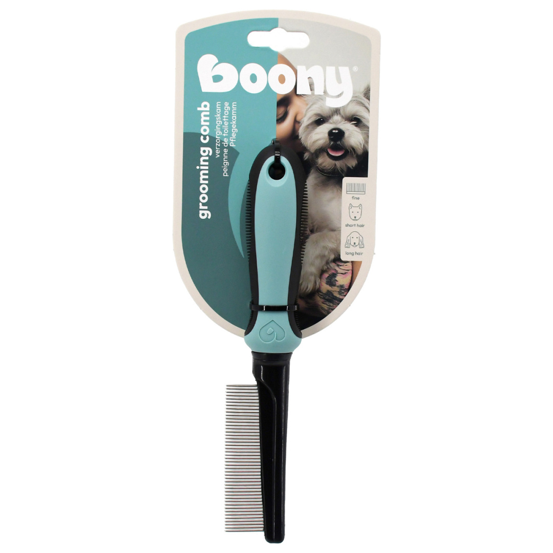 Deze Boony Fijne verzorgingskam is onmisbaar voor honden met een lange, dunne vacht. De kam maakt de vacht los en verwijdert daarbij op een doeltreffende manier losse haren, vuil en beginnende klitten. Zo blijft de vacht gezond, schoon en vrij van verstoringen.
