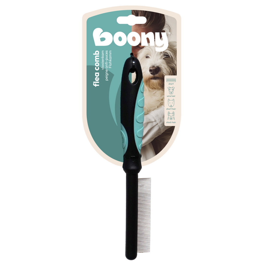 Deze professionele Boony Vlooienkam met korte tanden is de ideale keuze voor honden met een korte of ruwe vacht. De fijne, stevige tanden dringen diep genoeg door de vacht om vlooien, eitjes en vuil efficiënt te verwijderen, zonder de gevoelige huid van je hond te irriteren.