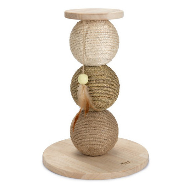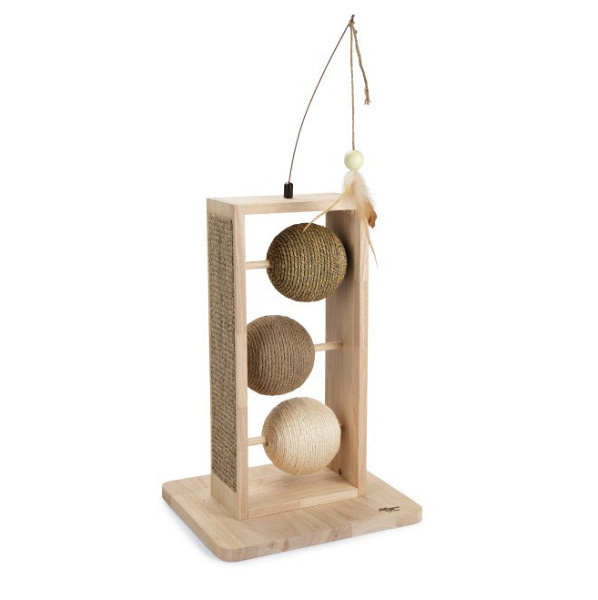 Drie krabbollen van rubberhout en 3 soorten touw. Met leuk speelveertje voor extra speelplezier. Afm. 34,5 x 29,5 x 50 cm.