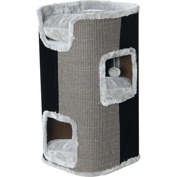 Modern model met twee gaten en drie comfortabele ligplaatsen. Buitenzijde bekleed met krabmat. Incl. pluchen kussentjes en een speelballetje. Afm. 43 x 43 x 75 cm.